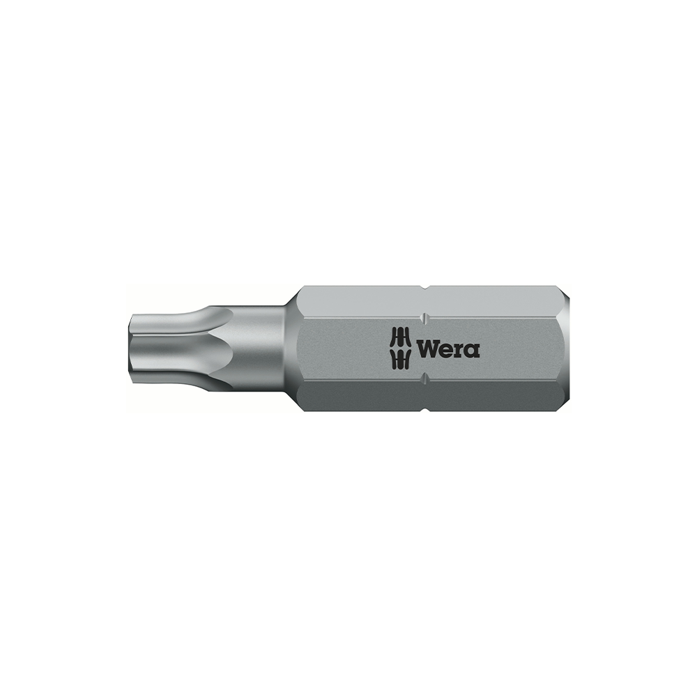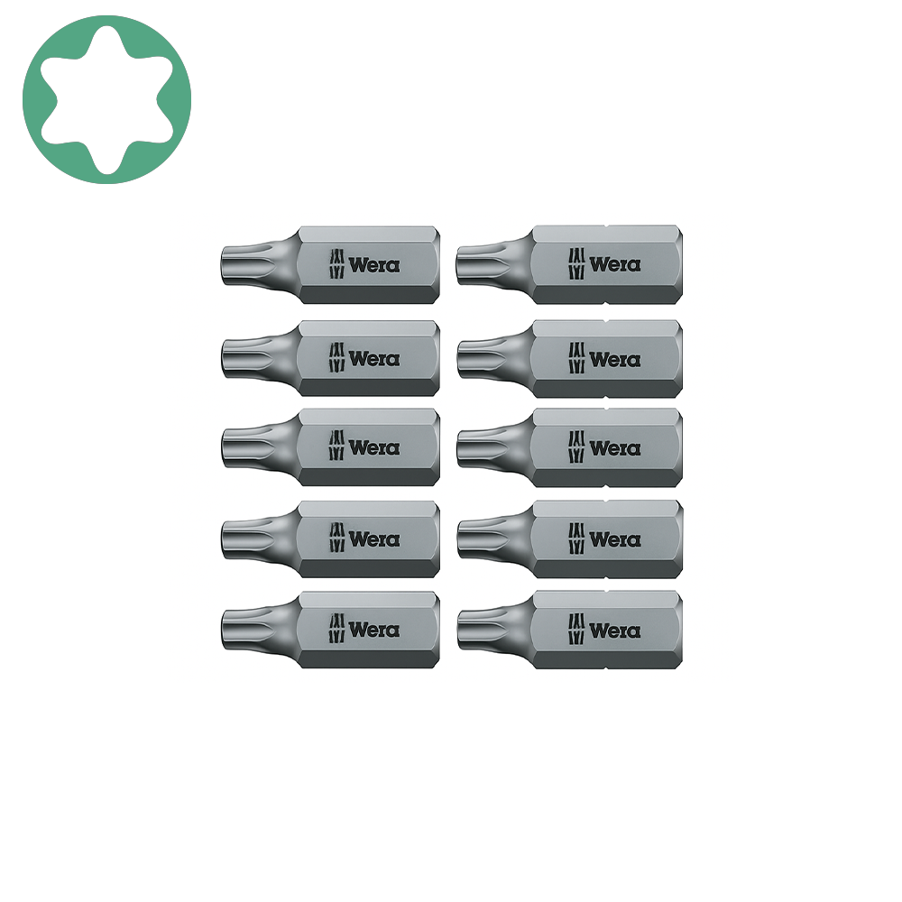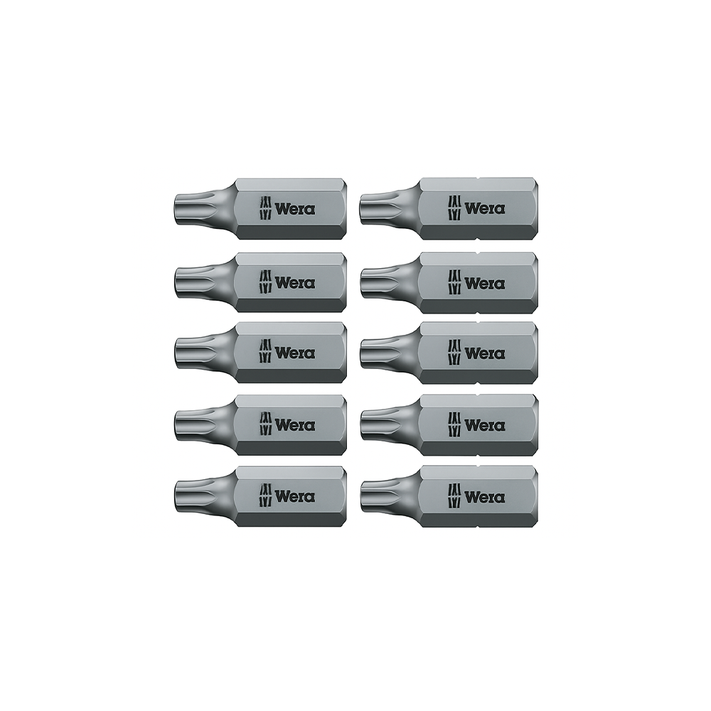 The set includes 10 premium Wera bits designed for recessed TORX® screws, ensuring durability and precision. Each bit has a length of 25 mm with a 1/4" hexagonal drive, fully compatible with all standard bit holders. Robust construction provides reliable performance for universal use in demanding applications.
