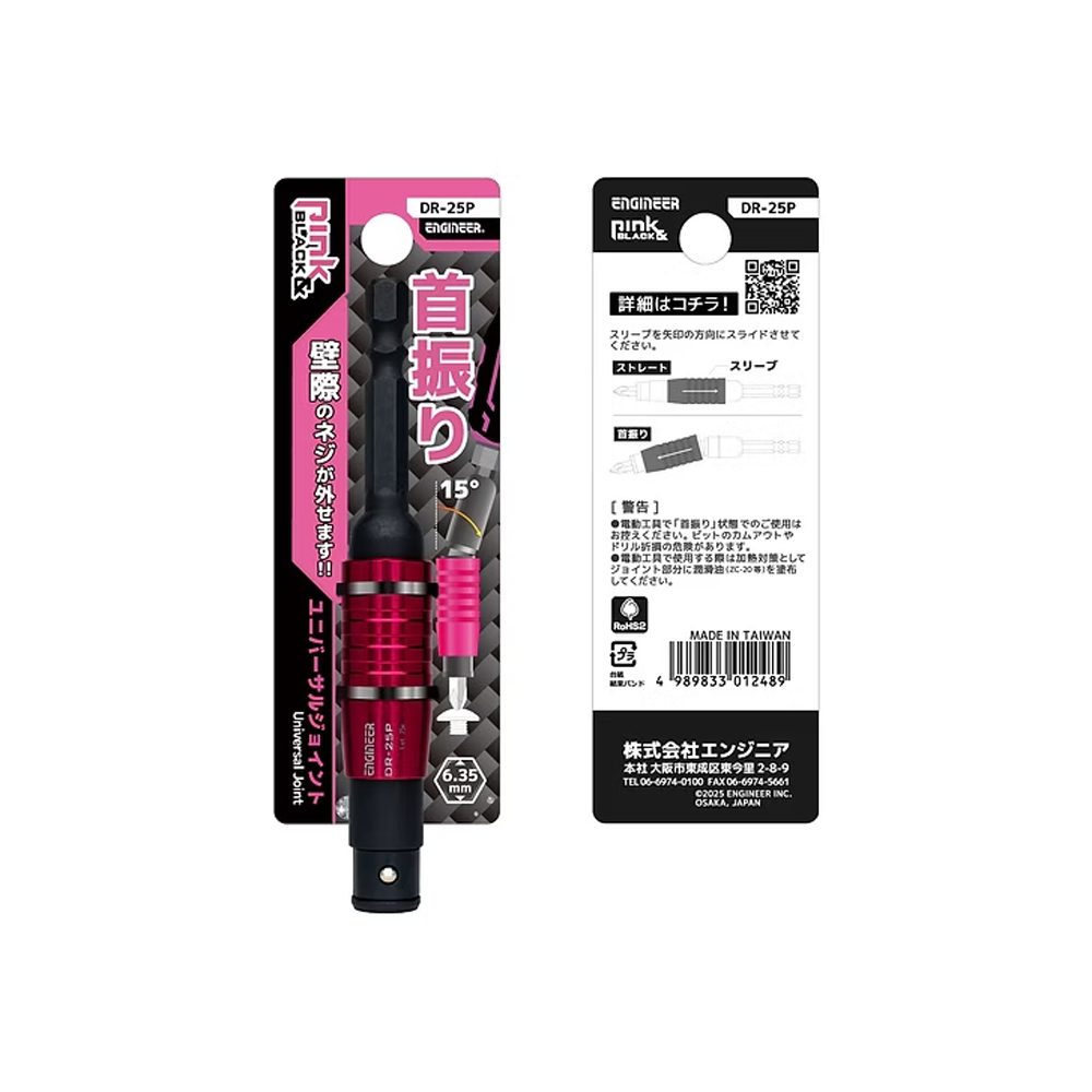 ENGINEER DR-25P is a professional universal joint/extension for bits, designed for easy access to screws located in corners, near walls, or in tight spaces. Thanks to its articulated mechanism, it allows angled operation without compromising control or efficiency.