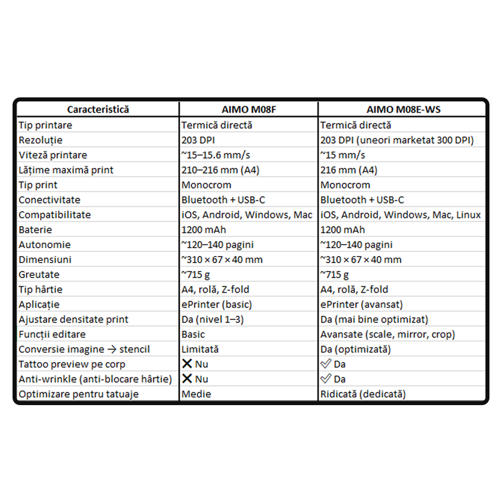 AIMO M08E-WS A4 portable thermal printer, direct thermal transfer, tattoo stencil printing, Bluetooth or Type C connection, 1200 mAh Li-Ion battery, compatible with IOS, Android, MAC or Windows