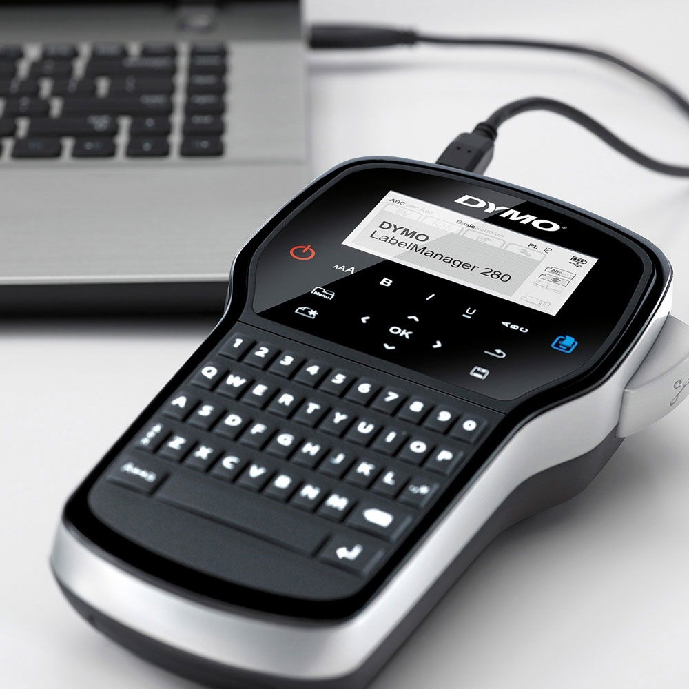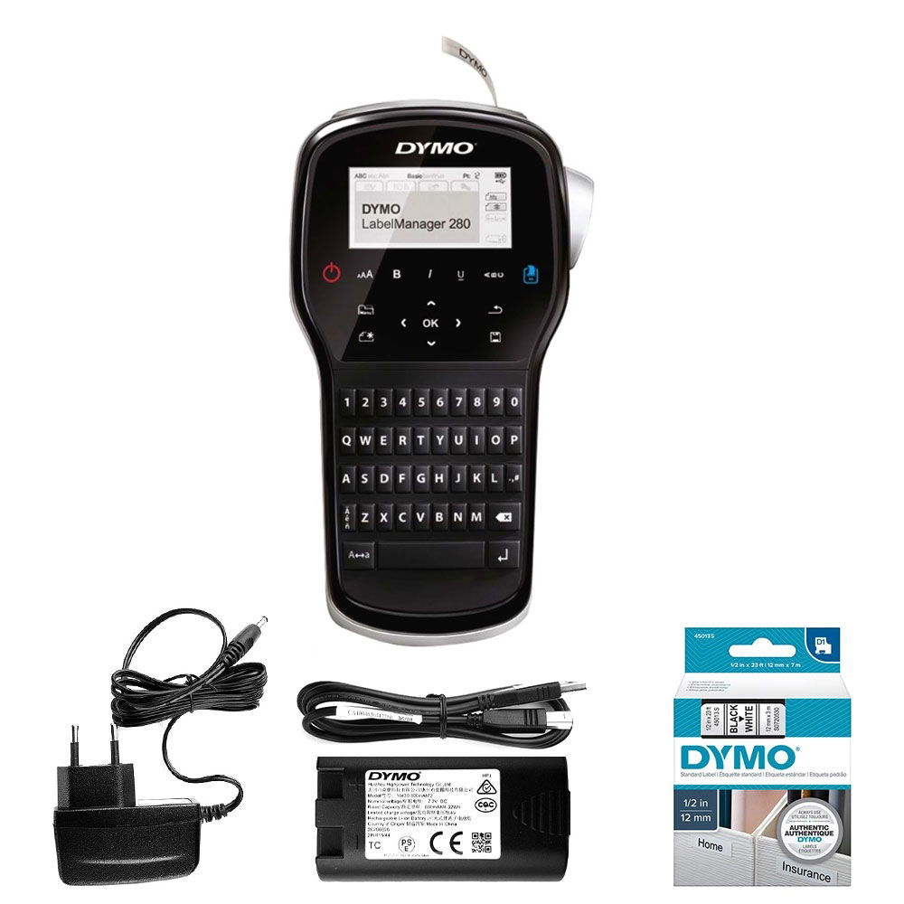 Continut Pachet: Acumulatori Li-Ion, Cablu USB 2.0, Incarcator/Adaptor DYMO retea 230V DY40076 S0721440, Etichete autocolante, DYMO LabelManager D1, 12mm x 3m, negru/alb, 45013S, Aparat de etichetat (imprimanta etichete) DYMO LabelManager 280P S0968960